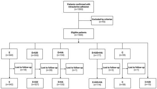 Overall, patients with IUA underwent hysteroscopic electric resection (E) or cold scissors separation (C), as well as hormone therapy and one or both of the following secondary prevention measures: intrauterine devices (IUD) and hyaluronic acid gel (HA).