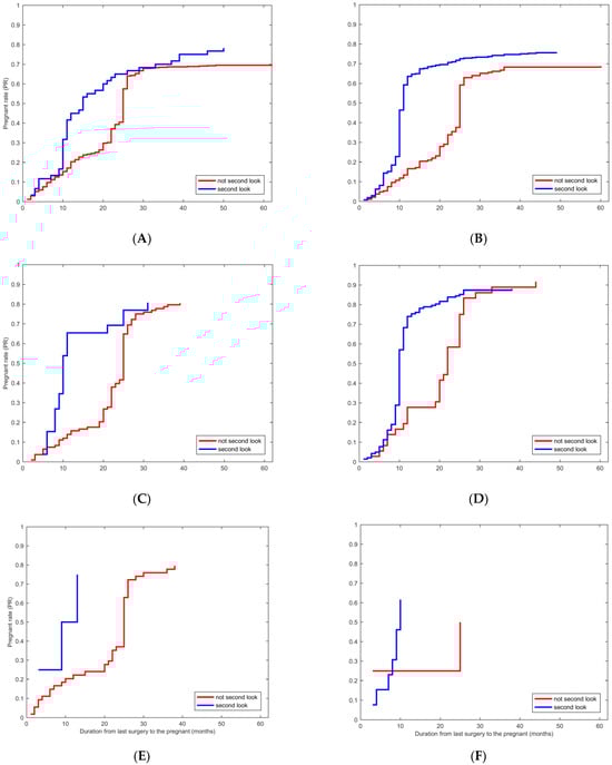 Figure 2. Kaplan–Meier plot for treatments associated with PR. (A) Kaplan–Meier plot for treatments associated with PR in all patients with IUA, p < 0.003; (BD) Kaplan–Meier plot for treatments associated with PR in patients with mild (p < 0.005), moderate (p < 0.003), and severe (p < 0.016) adhesion, respectively. (E,F) Kaplan–Meier plot for treatments associated with PR in patients who received second looks (p < 0.05) and who did not (p < 0.05).