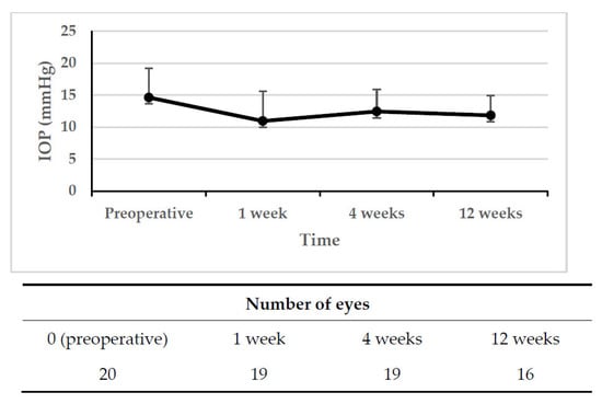 Preoperative and postoperative mean IOPs (mmHg). Error bars show standard deviation. The mean preoperative IOP was lowered immediately after the needling procedure (p = 0.0006, Wilcoxon’s rank sum test). The effect of IOP reduction was continued to 12 weeks (p = 0.0012, Wilcoxon’s rank sum test). Error bars show the standard deviation.