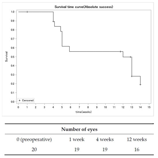 Kaplan–Meier survival plot for absolute success. We characterized absolute success as achieving a >20% reduction in IOP from the preneedling baseline without the use of antihypertensive medications (excluding the instillation of ripasudil). If the IOP exceeded the predefined criteria in two consecutive measurements, failure was deemed to have occurred at the initial time point when the IOP first exceeded the criteria. The necessity for repeat needling or an alternative glaucoma surgical intervention was categorized as a failure.