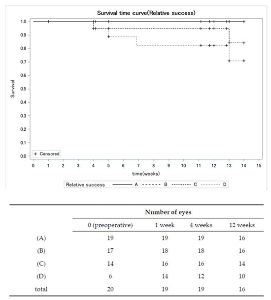 We also assessed the treatment’s efficacy as the secondary endpoint. We characterized absolute success as achieving a >20% reduction in IOP from the preneedling baseline without the use of antihypertensive medications (excluding the instillation of ripasudil). If the IOP exceeded the predefined criteria in two consecutive measurements, failure was deemed to have occurred at the initial time point when the IOP first exceeded the criteria. The necessity for repeat needling or an alternative glaucoma surgical intervention was categorized as a failure. We further characterized relative success as achieving an IOP within the ranges (A) 4 mmHg or higher but less than 22 mmHg, (B) 4 mmHg or higher but less than 19 mmHg, (C) 4 mmHg or higher but less than 16 mmHg, or (D) 4 mmHg or higher but less than 13 mmHg, in an attempt to adhere to the outcome criteria outlined by the World Glaucoma Association guidelines. If the IOP exceeded the defined criteria in two consecutive measurements, failure was deemed to have occurred at the initial time point when the IOP first exceeded the above criteria. The necessity for repeat needling or another glaucoma surgical intervention was classified as a treatment failure.