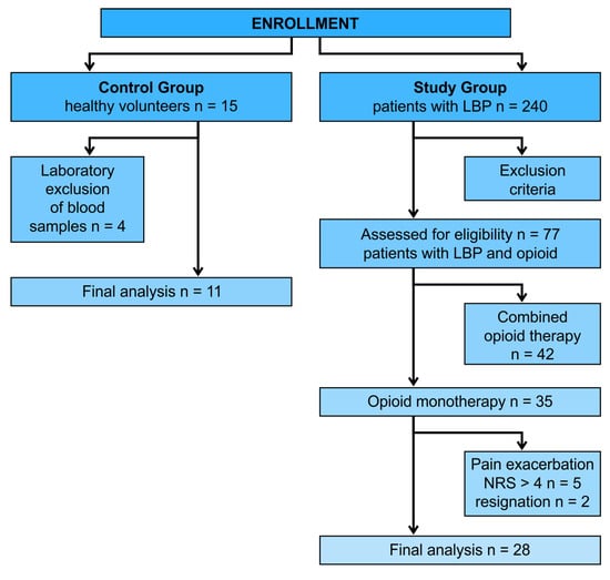 This study was approved by the Ethical Committee for Human Studies of the Medical University of Bialystok, Poland, and was registered on ClinicalTrials.gov (NCT04227223). The inclusion criteria were as follows: age 18–80 years old with LBP, with opioid therapy resulting in a stable NRS (numerical rating scale) value less than 4. Patients more than 80 years old with cognitive disorders who were receiving anti-inflammatory therapy (nonsteroidal anti-inflammatory drugs (NSAIDs), steroids, and other immune-modulating agents) were excluded. The control group included healthy volunteers. Pain related to spinal tissues, as well as radiculopathy pain, with a duration over 3 months was adopted as the definition of chronic LBP.