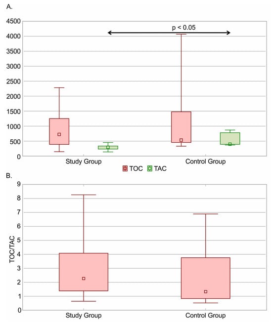 (A) Total Oxidant Capacity [TOC] and Total Antioxidant Capacity [TAC] and (B) TOC/TAC ratio in Study and Control Group.The median, minimum and maximum, and interquartile ranges are presented.
