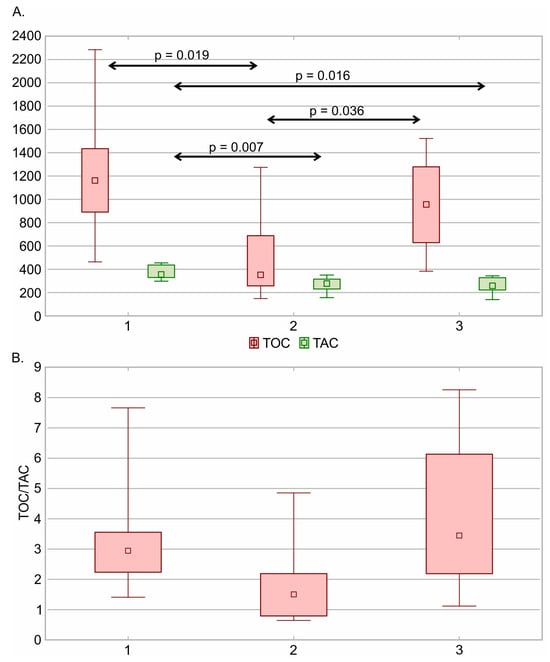 (A) Total Oxidant Capacity [TOC] and Total Antioxidant Capacity [TAC] and (B) TOC/TAC ratio in different opioid substances. 1—oxycodone, 2—buprenorphine, 3—tramadol. The median, minimum and maximum, and interquartile ranges are presented.
