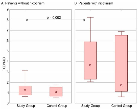 The values TOC/TAC ratio in patients without nicotinism (A) and with nicotinism (B) in Study and Control Group. The median, minimum and maximum, and interquartile ranges are presented.