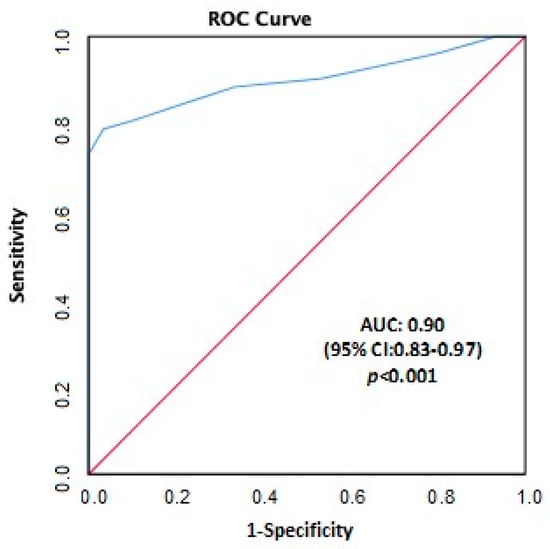 The independent effects of the significant variables on the prediction of PSH between those who developed PSH and those who did not were evaluated using logistic regression analysis. It was found that the EtCO2 difference had an independent effect on the prediction of PSH (p < 0.05), whereas age and IPI difference did not (p > 0.05) (Table 4). One unit decrease in EtCO2 from the baseline increased the risk of PSH by 3.3 times. ROC curve analysis showed that the magnitude of change in EtCO2 was diagnostic for predicting PSH (AUC: 0.90 (0.83–0.97; p < 0.001)) (Figure 1). The cut-off value for the amount of change in EtCO2 was established at 2.5, and the sensitivity, specificity, and positive and negative predictive values were computed in accordance with this value. Using the cut-off value of 2.5 for the EtCO2 difference, the sensitivity was 80.8%, the specificity was 90.0%, the positive predictive value was 93.3% and the negative predictive value was 73.0%.