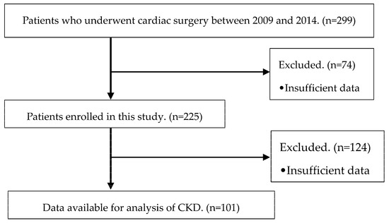 We collected medical information from 299 patients, 74 of whom were excluded due to insufficient data. Therefore, 225 patients were included in the present study. A total of 124 patients were excluded from the evaluation due to insufficient data and preoperative CKD, and 101 patients were enrolled for the analysis of CKD (Figure 1).
