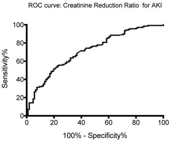 Area under the ROC curve of the creatinine reduction ratio for AKI prediction.