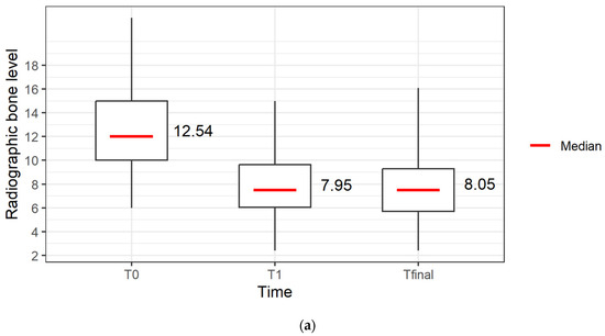 | rBL per tooth with final follow-up > 12 months | 23 | 13.09 ± 3.12 | 8.21 ± 3.08 | 8.39 ± 3.70 | |