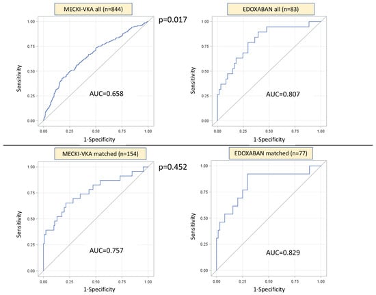 The prognostic power of the MECKI score evaluated using the AUC at the 2-year follow up in the edoxaban-treated group was higher than that of the entire retrospective MECKI-VKA population (0.8067 vs. 0.6576, respectively, p = 0.017) (Figure 1, top panel).