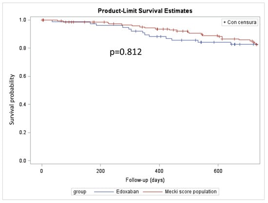 After propensity score, we recorded 23 (15%) cardiovascular events in the MECKI-VKA-matched population and 13 (17%) in the edoxaban population (p = 0.700), within 2 years from enrolment data. In this case, the MECKI score performed similarly in predicting the outcome in the two groups (AUC of MECKI-VKA-matched population 0.757, AUC edoxaban group 0.829, p = 0.452) (Figure 1, bottom panel).