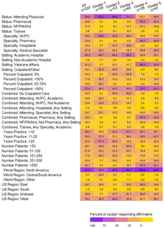 - Cluster 1: Attending physicians in internal medicine/primary care treating patients in academic or outpatient settings outside of the United States (US) with >25 years in practice and <250 patients.