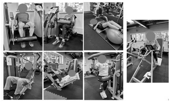 Each training session aimed to achieve an exercise intensity of 70% of 1RM and consisted of three sets of 12 repetitions for each exercise, including incline bench press, 45 degrees leg press, latissimus pull-down, trunk crunch, T-bar row, leg extension, and leg curl (Figure 1).
