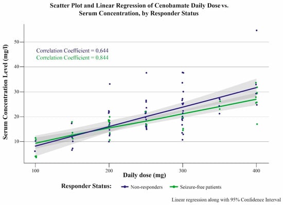 Independently of the efficacy and the tolerability, we found a strong and linear correlation between the daily cenobamate dose and the plasma levels (see Figure 1 and Figure 2). In the whole group, the correlation coefficient was 0.701; in seizure-free PWEs, it was 0.844, and in non-responders, it was 0.644.