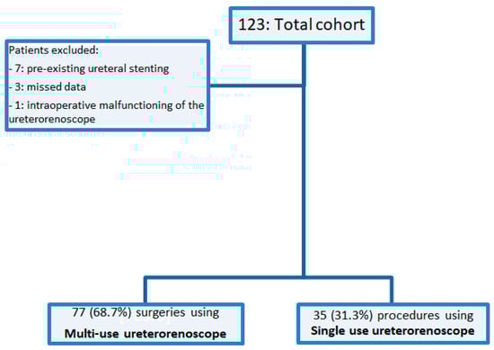 After the first retrospective evaluation, we excluded seven patients with pre-existing ureteral stenting and three patients with missing data. Additionally, after treatments, one patient was excluded from the analysis due to intraoperative malfunctioning of the ureterorenoscope (n = 1). Out of 123 cases, we obtained a final cohort of 112 cases, as shown in Figure 1 (flow diagram). Of the total count considered, 77 surgeries (68.7%) were performed using a multi-use ureterorenoscope, while 35 procedures (31.3%) utilized a single-use ureterorenoscope. Table 2 shows our cohort characteristics. The median age and BMI of the cohort were 58 years (IQR, 50–66) and 26.12 kg/m2 (IQR, 23.74–29.39), respectively. Left renal stones were observed in the majority of patients (58%), followed by right renal stones in 39% of cases and bilateral lithiasis in only 3% of cases. The median stone size and Hounsfield Units (HU) were 12 mm (IQR, 9.5–17.5) and 1350 (IQR, 950–1640), respectively. The majority of procedures utilized Holmium laser lithotripsy (69.9%), while 30.1% underwent lithotripsy with Thulio® utilizing RealPulse technology (Dornier, MedTech). The median operative time was 57 min (IQR 35–85). Following the endoscopic procedures, 25 patients (22.3%) developed postoperative Gram-negative UTIs.