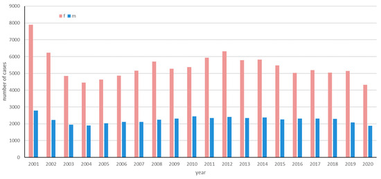 The incidence of LS was analyzed over a 20-year period (2001 to 2020). Figure 2 shows the number of incident cases for female and male patients between 2001 and 2020.