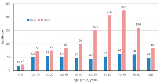 The data included patients diagnosed at both inpatient and outpatient care units, but not primary care. Patients of all ages, diagnosed with LS between 2001 and 2020, were included in the study. The number of cases ranged from 4323 to 7901 per year for female patients and from 1875 to 2786 for male patients. The mean annual number of LS cases during those years was 7721.2; by dividing it by the mean background population during that period (n = 9,550,145), the incidence was estimated. The mean annual incidence of LS in Sweden 2001 to 2020 was 7721.2/9,550,145 = 80.9 cases/100,000 persons. When disaggregated by gender, the mean annual incidence for females was significantly higher, recorded at 114.4 new cases per 100,000 persons/year, compared to males, who presented a lower incidence rate of 47.2 new cases per 100,000 persons/year. The mean annual incidence peaked for male and female patients in the 70–79 age group with 62.4/100,000 for males, and with 224.8/100,000 (Figure 3). In females of fertile age (20–39 years old), the incidence of LS was notably prominent, comprising approximately 17.43% of the female LS patient population in the study. The incidence for female patients were significantly higher in all age groups except for those 0–9 and over 90 years of age (Table 2).