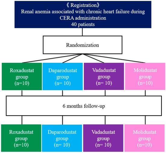 Patients were randomized by the envelop method to receive treatment with roxadustat (Astellas Pharma Inc., Tokyo, Japan), daprodustat (Kyowa Kirin Co., Ltd., Tokyo, Japan), vadadustat (Mitsubishi Tanabe Parma Co., Osaka, Japan), or molidustat (Bayer Yakuhin, Ltd., Osaka, Japan) for 6 months under the management of an outpatient primary care physician (Figure 1). After assignment to the intervention, the primary care physician was blinded to the type of drug. After a two-week wash-out period after discontinuation of the CERA, the initial dose of HIF-PH inhibitor recommended by the drug manufacturer (roxadustat: 70 mg/day, 3 times weekly; daprodustat: 4 mg/day; vadadustat: 300 mg/day; molidustat: 25 mg/day) was administered. Thereafter, the dose was adjusted to maintain the Hb level in the range of 11 to about 13 g/dL; there is no target Hb range for HIF-PH inhibitors, so in this study, we used the Hb range of 11–13 g/dL recommended for ESA treatment for renal anemia in the Japanese Evidence-based Clinical Practice Guideline for Chronic Kidney Disease. Each HIF-PH inhibitor is indicated for the conservative treatment of renal anemia in Japan and is covered by health insurance. Informed consent was obtained from patients after informing them that the HIF-PH inhibitor was for the treatment of renal anemia.