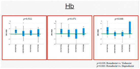 Hb levels showed no statistically significant change from the value during CERA treatment to that during HIF-PH inhibitor treatment as follows: roxadustat, p = 0.128; daprodustat, p = 0.751; vadadustat, p = 0.431; and molidustat, p = 0.238. In the comparison of Hb changes between the four HIF-PH inhibitors, there was no statistically significant difference between the drugs at month 1 (p = 0.532) or 3 (p = 0.471); however, at month 6, a statistically significant difference was found (p = 0.048), and Hb increased significantly more with roxadustat than with vadadustat (p = 0.039) and daprodustat (p = 0.043) (Figure 2).