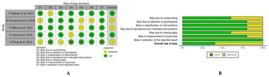 Risk of bias assessment using ROBINS−I tool according to Cochrane network. Risk of bias summary (A) and risk of bias graph (B) [,,,,].