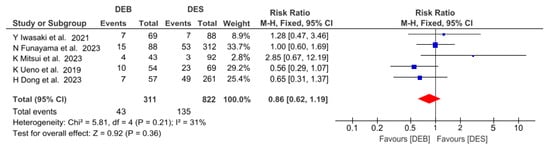 MACE data at 12 months were available for all patients in the five studies included in the analysis. The definition of MACE was homogeneous across studies, although in the article from H Dong et al. [], stroke was included in the composite of major events. The risk ratio for this primary endpoint was numerically lower for DEBs as compared with the DES group, but this difference was not statistically significant for DEBs compared with the DES group (RR 0.86 [0.62 to 1.19]; p = 0.36; I2 = 31%) (Figure 3). Sensitivity analyses adding or removing studies with large samples did not change the overall risk of MACE.