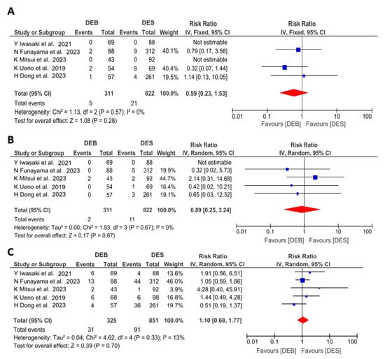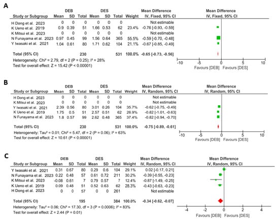 Acute angiographic results after the procedure were available in three of the included studies. Worse results in terms of acute gain (MD −0.65 [−0.73 to −0.56]; p = < 0.01; I2 = 28%) and MLD (MD −0.75 [−0.89 to −0.61]; p = 0.06; I2 = 63%) were found in the DEB group compared to the DES group, as shown in Figure 5A,B. Data on the angiographic follow-up were available in 579 lesions from four studies. In the pooled estimated mean difference (Figure 5C), LLL was significantly reduced for the DEB group compared with the DES group (MD −0.34 [−0.62 to −0.07]; p = 0.01; I2 = 83%).