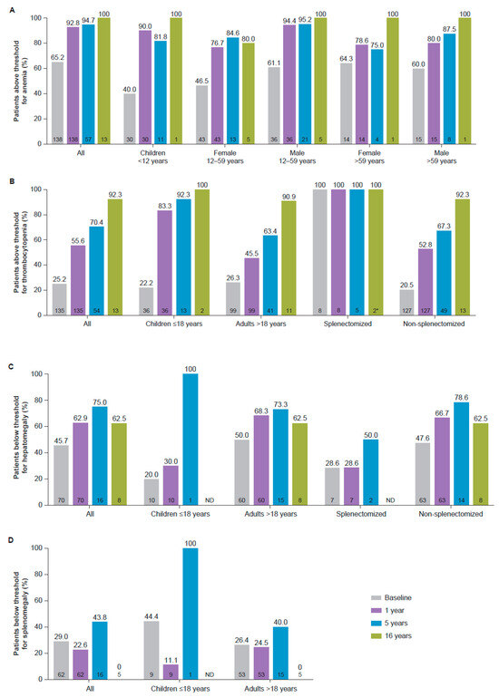 Proportion of patients above standard diagnostic thresholds for (A) anemia and (B) thrombocytopenia, and below thresholds for (C) hepatomegaly and (D) splenomegaly. * For thrombocytopenia, the last time-point in splenectomized patients was 15 years. Thresholds for anemia, thrombocytopenia, hepatomegaly, and splenomegaly are summarized in Table 1. Sample size at each time-point is indicated within each bar (bottom). ND, no data.