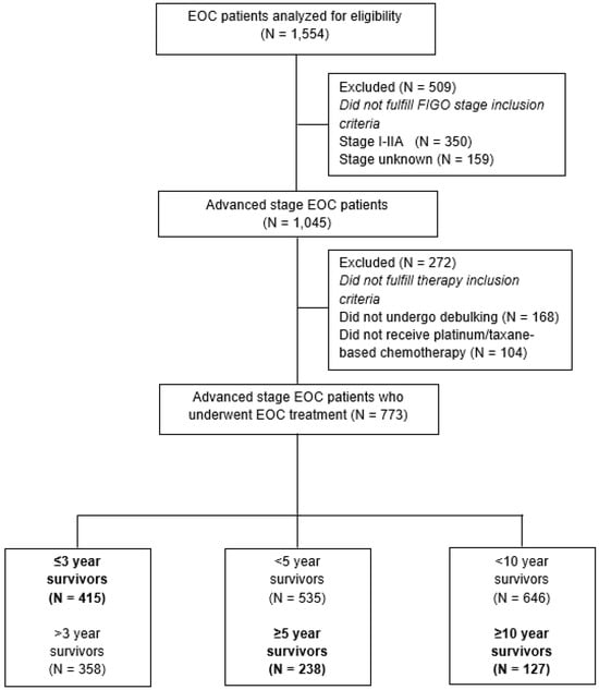 Epithelial ovarian cancer (EOC) is the leading cause of death from gynecologic cancers in the western world [1]. In 2020, approximately 314,000 new cases of EOC and 207,000 EOC-related deaths were reported worldwide [2]. EOC predominantly affects postmenopausal women. The symptoms are nonspecific, such as abdominal fullness or distension, bloating, early satiety, nausea, fatigue, change in bowel movements, urinary symptoms, back pain, or unintended weight loss [3]. The diagnosis is based on gynecologic physical examination, transvaginal ultrasound, and the measurement of cancer antigen 125 (CA-125) level. Histologically, there are four main subtypes: serous, endometrioid, clear cell, and mucinous tumors [3,4]. Due to the nonspecific symptoms and the lack of effective screening tools for early detection, most patients are diagnosed at an advanced stage, i.e., International Federation Gynecology and Obstetrics (FIGO) stages IIB–IV [3]. In advanced-stage EOC, standard treatment includes cytoreductive surgery combined with platinum/taxane-based chemotherapy [5]. In the recent decade, the antiangiogenetic agent bevacizumab and poly(ADP-ribose) polymerase (PARP) inhibitors have been introduced as maintenance therapy for advanced-stage EOC [4]. While most patients achieve complete remission, 60–80% experience disease relapse and often succumb to the disease within 5 years after being diagnosed [6,7]. Nevertheless, a subgroup of patients may be long-term survivors, beyond 5–10 years [7,8,9,10,11,12,13]. This may depend on multiple factors including FIGO stage, age, histologic subtype, tumor grade, performance status, or residual disease.