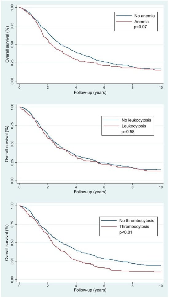 Kaplan–Meier survival curves for the overall survival of the different pretreatment hematologic parameter subgroups. The patients with pretreatment anemia (N = 225), leukocytosis (N = 119), or thrombocytosis (N = 155) are demonstrated in red, whereas patients without pretreatment thrombocytosis (N = 389), leukocytosis (N = 461), or anemia (N = 505) are demonstrated in blue. The p-values are provided at the different Kaplan–Meier survival curves.
