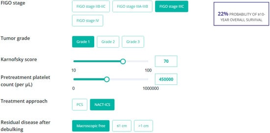 Snapshot of the online score calculator for the ≥10-year OS model. The online score calculator allows clinicians to estimate the probability of ≥10-year overall survival. For example, for a patient with FIGO stage IIIC EOC who presented with a low-grade tumor, Karnofsky score of 70, pretreatment platelet count of 450,000 per µL, and who underwent NACT-ICS with complete cytoreduction, their nomogram predicts a probability of 22% of ≥10-year OS for this patient.