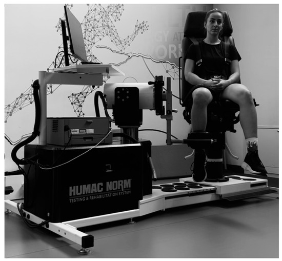 18]. Before the test began, verbal instructions were given to generate as much force and power as possible during the test. Furthermore, no verbal prompts were used during the study, but the computer screen was set so that participants could receive feedback in real time. The subject sat in a stretched position with the backrest at an angle of 85°. The axis of rotation of the knee joint was placed in line with the axis of rotation of the dynamometer. To avoid restricting the movement of the ankle joint, a lever arm cap was attached to the head of the fibula.