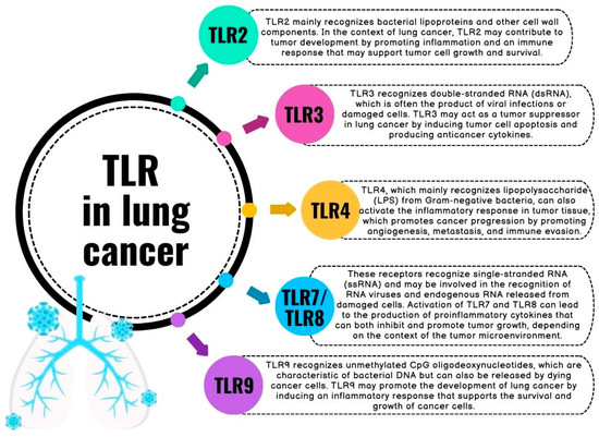 The innate immune system plays a fundamental role in recognizing and responding to various pathogens, and danger signals through pattern recognition receptors (PRRs), among which TLRs are prominent members [10,11]. Aside from their role in infection control, TLRs have gained considerable attention due to their involvement in tumorigenesis and tumor progression [12]. Preclinical studies have revealed that aberrant TLR signaling can promote tumor cell proliferation, metastasis, and immune evasion, implicating TLRs as potential players in the intricate network of tumorigenic processes [13,14,15,16]. TLRs play a key role in the development and treatment of lung cancer, although their functions may be opposing (Figure 1). These receptors are widely expressed on various cell types, including those in the lung epithelium as well as immune cells such as myeloid and lymphoid cells. Studies indicate that TLR3 can promote the formation of metastases but also participate in the induction of apoptosis and the reactivation of local innate reactions. Another example is the role of TLR9, the increased expression of which in tissue supported the progression and metastasis of lung cancer, and on the other hand, its activation by CpG-ODN induced anticancer effects. Activation of TLR receptors may influence the development of the immune response and the balance in the tumor microenvironment (TME), which ultimately determines its progression or regression [17,18,19,20,21].