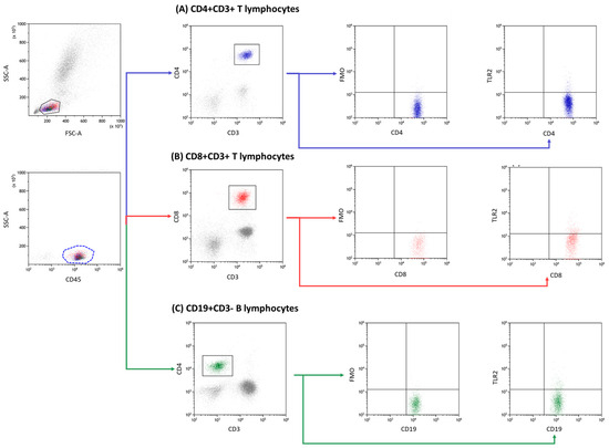 Exemplary analysis of the cells’ immunophenotype and the determination of the percentage of positive TLR expression on the example of TLRCD4+CD3+ subpopulation marked in blue, CD8+CD3+ subpopulation in red, and CD19+CD3− subpopulation in green. Points (A–C) indicate the method of reading TLR2 using the FMO control.