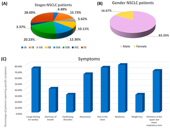 Characteristics of patients with NSCLC included in the study. (A) Stages of NSCLC patients; (B) Gender of NSCLC patients; (C) Most common symptoms reported by NSCLC patients.