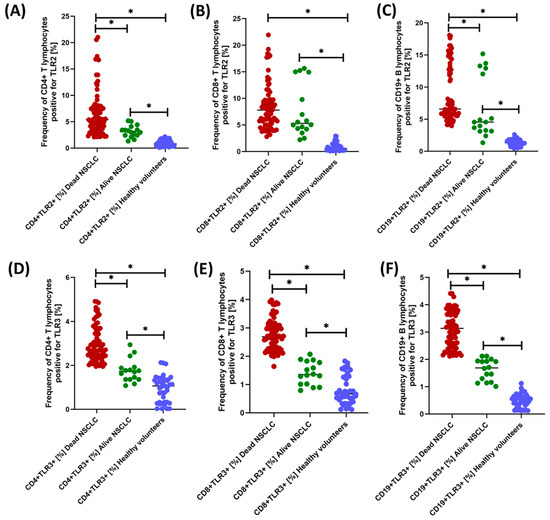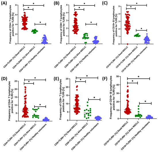 We observed much more statistically significant changes when analyzing the percentage of occurrence of individual subpopulations of T and B lymphocytes positive for the tested TLR receptors (Figure 4, Figure 5 and Figure 6 and Table 4). Of course, the level of expression of the tested TLRs was significantly higher in NSCLC patients compared to healthy volunteers, but their analysis between NSCLC alive patients and NSCLC death deserves special attention. Except for CD19+TLR4+, all median values in NSCLC death patients were higher than in NSCLC alive patients. The ratio of the recorded values ranged from 1.39-fold for CD19+TLR7+ to 2.81-fold for CD19+TLR9+, which highlights the significant range of changes in the percentage of occurrence of individual subpopulations of lymphocytes, especially B-positive for the expression of the tested TLRs.