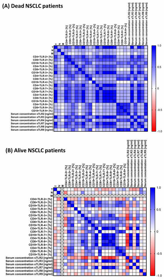 Graphical representation of Spearman rank correlations obtained for NSCLC dead (A) and NSCLC alive (B) patients. Positive correlations are marked in blue, while negative correlations are marked in red. The differentiation of shades of the mentioned colors is equivalent to the level of correlation. By positive correlations, we mean that as one parameter increases, the values of the other parameter increase, while by negative correlations we mean that as the value of one parameter increases, the values of the other parameter decrease. Abbreviations: CD—cluster of differentiation; TLR—Toll-like receptors; sTLR—soluble form of Toll-like receptors.