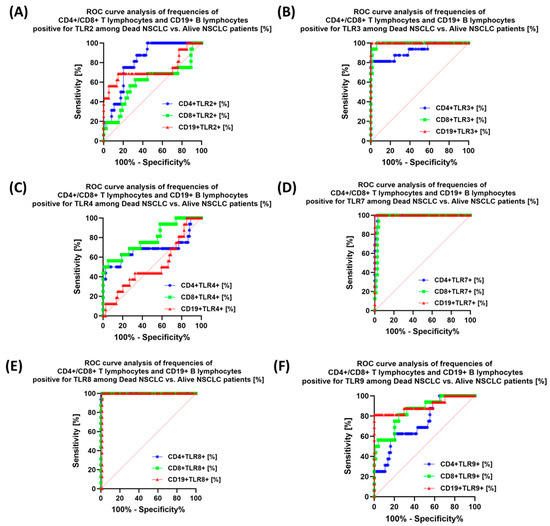 Graphical representation of the ROC analysis of selected immunophenotype parameters of dead NSCLC and alive NSCLC patients: (A) ROC curve for TLR2-positive lymphocyte percentage; (B) ROC curve for the percentage of TLR3-positive lymphocytes; (C) ROC curve for the percentage of TLR4-positive lymphocytes; (D) ROC curve for the percentage of TLR7-positive lymphocytes; (E) ROC curve for the percentage of TLR8-positive lymphocytes; (F) ROC curve for the percentage of TLR9-positive lymphocytes. Abbreviations: CD—cluster of differentiation; TLR—Toll-like receptors; ROC—Receiver Operating Characteristic.