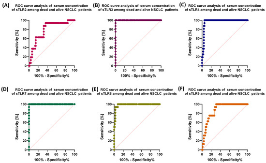 Graphical representation of ROC analysis of dissolved TLR concentrations for dead NSCLC and alive NSCLC patients: (A) ROC curve for sTLR2; (B) ROC curve for sTLR3; (C) ROC curve for sTLR4; (D) ROC curve for sTLR7; (E) ROC curve for sTLR8; (F) ROC curve for sTLR9. Abbreviations: sTLR—soluble form of Toll-like receptors; ROC—Receiver Operating Characteristic.