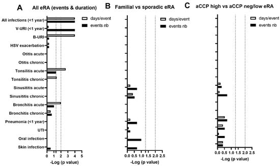 Number of infectious events and duration per event in the previous year at RA onset. (A) Comparison between eRA patients with healthy controls. (B) Comparison between familial and sporadic eRA patients. (C) Comparison between eRA patients having or not having an elevated immunization status against CCP at onset. Data are presented as log10 (p-value) with a significant threshold fixed at p 0.01 corresponding to the false discovery rate post hoc. Abbreviations: eRA: early rheumatoid arthritis; aCCP: anti-citrullinated peptide antibodies; Fam: eRA with familial cases of RA; Spo: sporadic eRA without familial cases reported; V-URI: viral-suspected upper respiratory infections; B-URI: bacterial-suspected upper respiratory infections treated with antibiotics; HSV: herpes simplex; UTI: urinary tract infections.