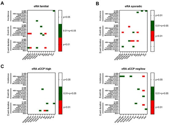 Next, to further test whether eRA sensitivity to infections in the year preceding the date of examination was not only qualitative but also quantitative, which may indicate an altered immune anti-infectious response, the analysis was repeated considering both the number of events and the episode duration per event (Table 5, Figure 3A). Indeed, when considering total individual infections, both parameters were increased in the year preceding the date of examination in the eRA subgroup as compared to the controls. Such an effect was related to the reporting of an increased number of events regarding viral-suspected URI (p < 0.0001). Moreover, episode duration was increased in eRA patients for bacterial-related URI (p = 0.0001), acute tonsillitis (p = 0.002), and acute bronchitis (p = 0.04). Of important note, such effects appeared to be independent of the familial/sporadic and ACPA status of the eRA subgroups.