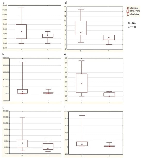 It turned out to be unexpected for us that infections in the patient’s history before RA onset appeared to impact RA indices (Figure 4). The Kruscal–Wallis median test revealed that in the eRAfam subgroup TB infection in earlier life was associated with a lower number of swollen joints (68 joint count, Chi-square = 3.93, df = 1, p = 0.05) and lower serum RF levels (Chi-square = 4.73, df = 1, p = 0.03). A similar trace was left by pneumonia in the patient’s history—eRAfam patients with this infection in the past demonstrated a lower ESR (Chi-square = 3.81, df = 1, p = 0.05).