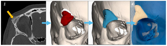 Planning, case 1. (1): Axial plane CT image of the supra-orbital region showing an extensive intra-osseous lesion (yellow arrow). (2): Digital segmentation of the lesion and planning of the resection margins. (3): Virtual design of the dimensions of the PSI. (4): Manufacturing and delivery of the implant.