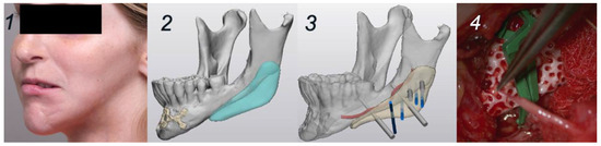 A 19-year-old woman was planned for reconstructive surgery of the left mandibular angle as part of a multistage treatment plan for left hemifacial asymmetry secondary to Parry–Romberg syndrome. The HA bioceramic PSI and corresponding cutting guide were virtually planned in Mimics and Proplan CMF™ (Materialise, Leuven, Belgium) mirroring the contralateral side. Based on the 3D CT images (0.6 mm slices), the screw holes were positioned in favorable relation with the alveolar nerve (Figure 3). The manufacturing process was equivalent to the first case. Lipofilling with peri-umbilical fat and a Superficial Circumflex Iliac Artery Perforator (SCIAP) flap were planned for soft tissue reconstruction. The prepared surgery was initiated with an extra-oral approach incising in the peri-angular region on the left side, dissecting and containing important nervous structures such as the marginal branch of the facial nerve. The 3D-printed cutting guide was inserted to drill the screw holes. The PSI was evaluated in the planned position before fixation. After insertion and fixation of the implant using 2 screws, the SCIAP-flap was harvested and anastomosed on the facial artery and vein (Figure 3). Surgery was completed with lipofilling of the left upper lip with harvested free abdominal fat.