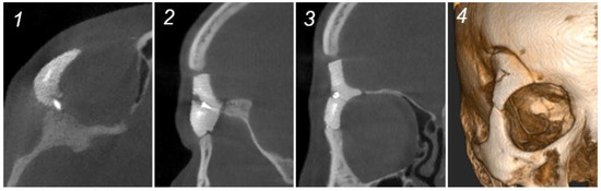 Radiological (CBCT) and clinical situation after 6 months, case 1. (1): Axial plane. (2): Sagittal plane—signs of osteogenesis. (3): Frontal plane—signs of osteogenesis. (4): 3D CT image.