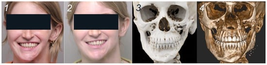 Clinical and radiological (CBCT) situation preoperatively and after 2.5 months, case 2. (1): Clinical situation pre-surgery—frontal plane. (2): Clinical situation 2.5 months post-surgery. (3): Radiological situation pre-surgery. (4): Radiological situation 2.5 months post-surgery.