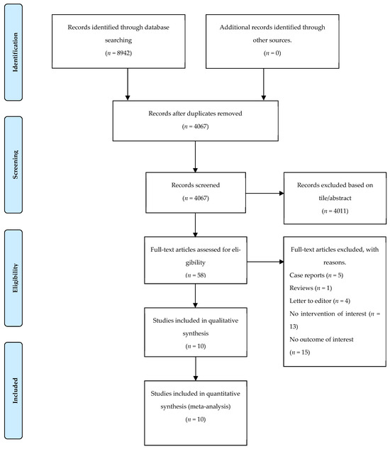 Out of 8942 articles initially identified in the literature search, 4067 remained following the elimination of duplicates. Subsequent analysis led to the inclusion of ten articles meeting the inclusion criteria for this review (Figure 1) [14,15,16,17,18,19,20,21,22,23].