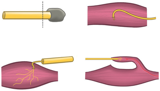 In the field of peripheral nerve surgery, neurectomy has lost its position as the standard surgical technique for symptomatic neuromas. Neurectomy has resulted in only modest pain relief and resection alone seems to be associated with unacceptable recurrence rates of painful neuromas [34]. This can be attributed to the technique’s “passive” nature, as it fails to address the regenerative potential of the nerve stump or provide a pathway for nerve regrowth [32]. According to Chappel et al., optimal management should entail “active” treatment of the excised nerve end, instead of burying or hiding it [23]. Active treatments include vascularized regenerative peripheral nerve interfaces (RPNI) and the previously mentioned targeted muscle reinnervation (TMR). In the case of vascularized RPNI, the excised nerve is implanted into vascularized, free muscle grafts, serving as denervated targets for axon ingrowth from the injured nerve (Figure 3). This approach has exhibited promising clinical results in improving neuroma pain and phantom pain. TMR, which has undergone more extensive research, has reported good postoperative results ranging from 67 to 93 percent [35,36,37]. A recent meta-analysis revealed that TMR achieved good postoperative results in 82 percent of patients with peripheral nerve neuromas, versus 60 percent after neurectomy (p < 0.05) [33].