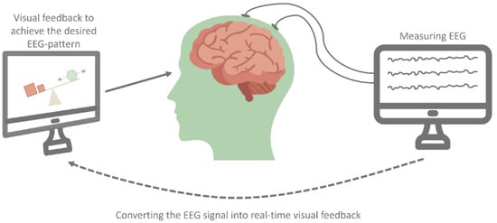 During the past few decades, chronic pain research has contributed to the current knowledge and led to new treatment perspectives. Nevertheless, chronic pain remains a major global health problem because of the disease burden, high prevalence, and financial costs [1,2,3]. It is generally acknowledged that chronic pain management should use a multidisciplinary approach in agreement with the biopsychosocial model [2]. In such an approach, non-pharmacological treatment options become more and more important [4]. One non-pharmacological therapy option is electroencephalography (EEG) neurofeedback, which targets brain activity. Over the last few decades, neurofeedback has been used to train individuals to control their brainwaves (see Figure 1). Throughout therapy sessions, EEG is constantly measured by placing electrodes on the scalp that record the electrical signals generated by neurons in the brain. From these raw EEG data, different frequency components can be calculated in terms of the number of waves per second (Hz). By providing subjects with real-time auditory or visual feedback regarding their brainwave activity, they can (unconsciously) learn to modify the targeted frequency band. It is thought that the modification of frequency bands can potentially lead to improvement in desired mental states, cognitive processes, and, in this case, chronic pain complaints [5,6].