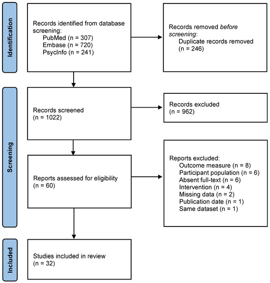 The initial search resulted in 1268 records, of which 1022 remained after duplicate removal (see Figure 2 for a flow diagram [12]). The evaluation of titles and abstracts led to the exclusion of 962 records that did not meet the inclusion criteria. Sixty full-text articles were assessed for eligibility. After the exclusion of another 28 articles that were not in line with the inclusion criteria, 32 studies were included in the present scoping review. Below, the characteristics of these studies are described. Then, an elaboration on the effects of the different types of neurofeedback on reducing chronic pain complaints is given. Finally, the adverse events and long-term effects are discussed.