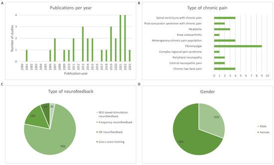 A visual representation of the study characteristics of the included studies. (A) The number of publications per year. (B) The types of chronic pain in the study population. (C) The frequency with which the type of neurofeedback was used as the intervention. (D) The gender distribution of the included studies.
